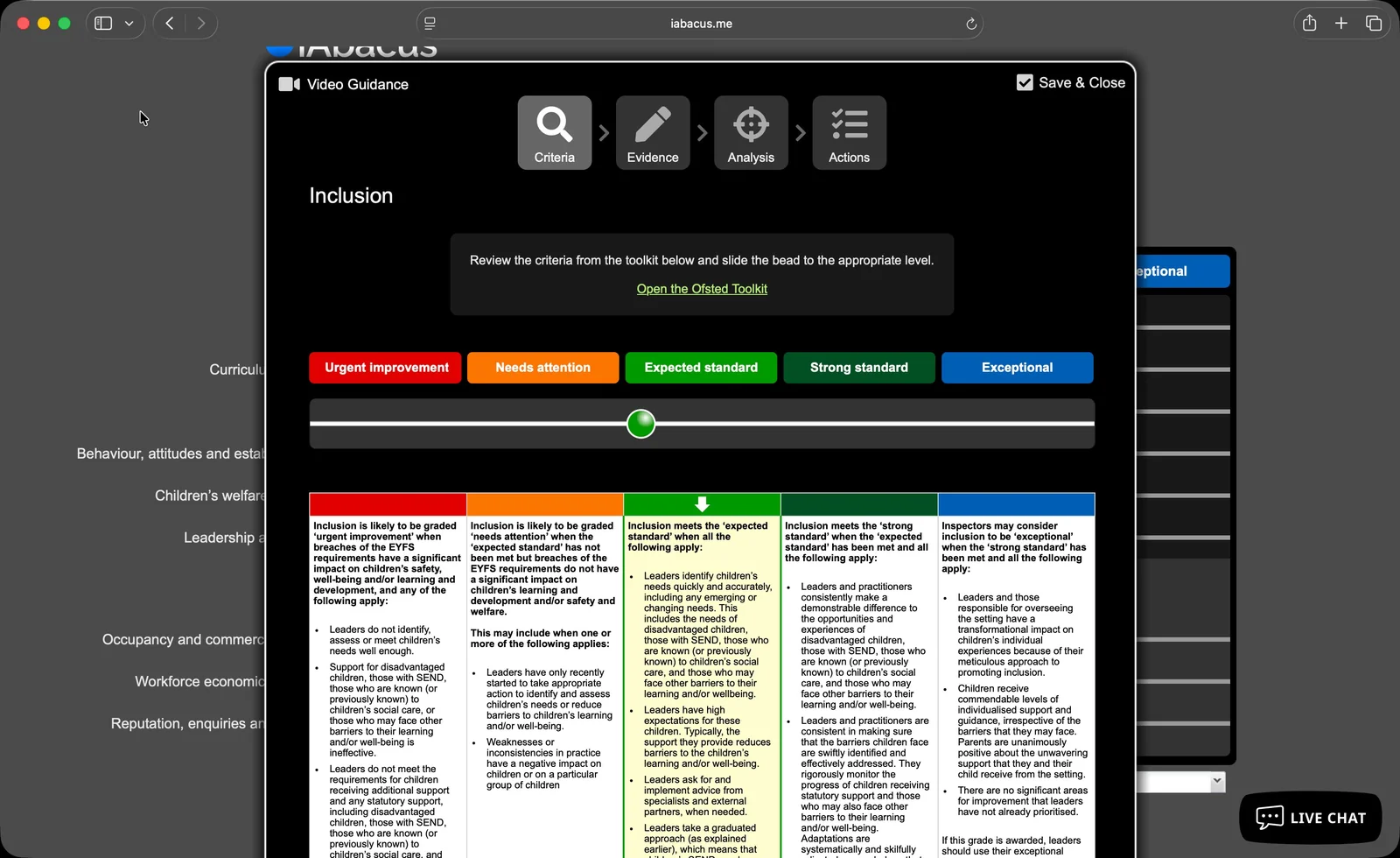 Now the manager opens the grade descriptors — taken directly from the Ofsted Early Years Inspection Toolkit for the Ofsted areas, or from your group's own criteria for everything else. They review the language against their judgement, and move the bead if they need to. This is where the honest view meets the formal standard.
